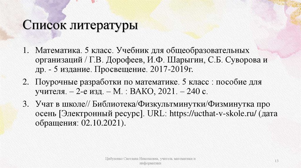 Список литературы1. Математика. 5 класс. Учебник для общеобразовательных