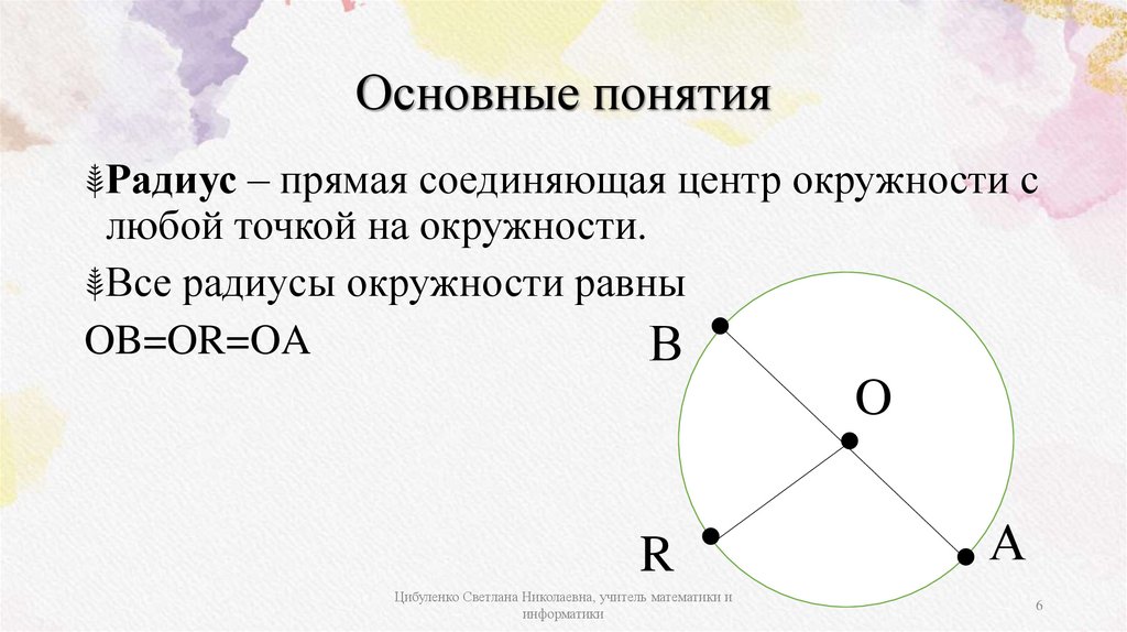 Основные понятия⸙Радиус – прямая соединяющая центр окружности с