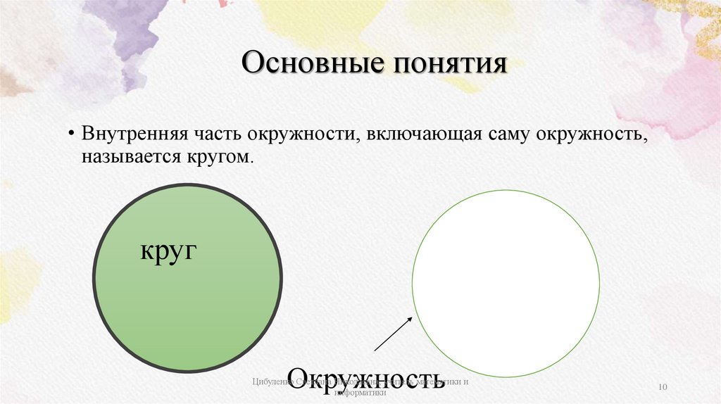 Основные понятия• Внутренняя часть окружности, включающая саму окружность,