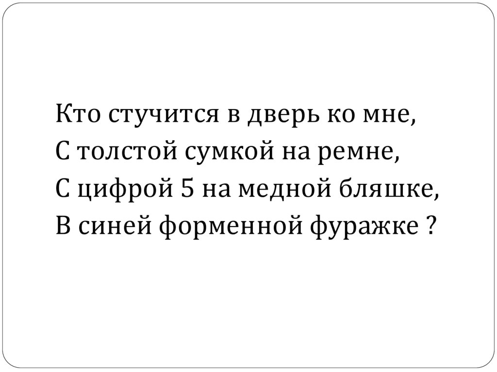 Кто стучится в дверь ко мне,С толстой сумкой на ремне,