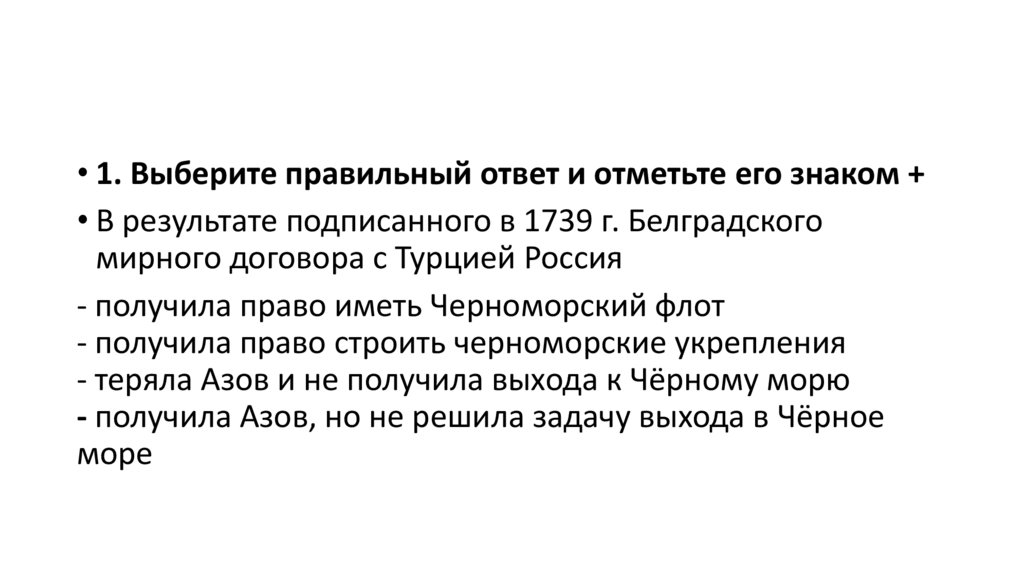 • 1. Выберите правильный ответ и отметьте его знаком +• В результате подписанного в 1739 г. Белградского
