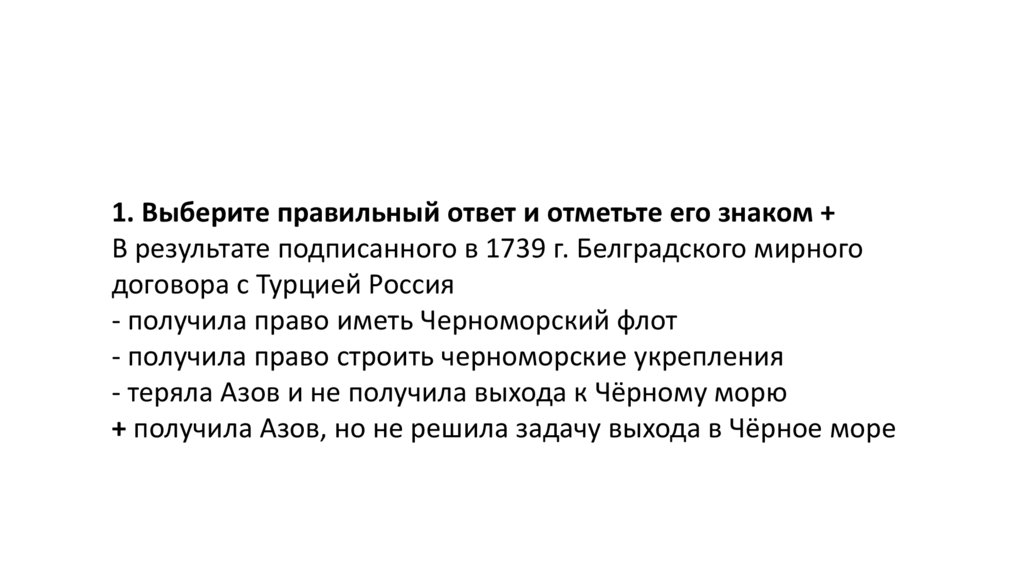 1. Выберите правильный ответ и отметьте его знаком +В результате подписанного в 1739 г. Белградского мирного