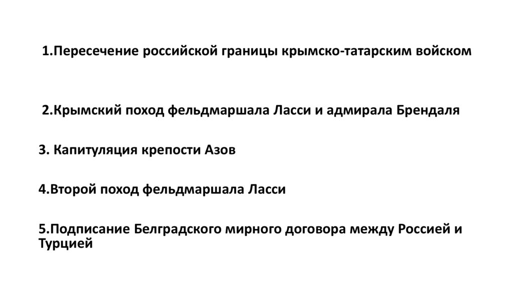 1.Пересечение российской границы крымско-татарским войском2.Крымский поход фельдмаршала Ласси и адмирала Брендаля