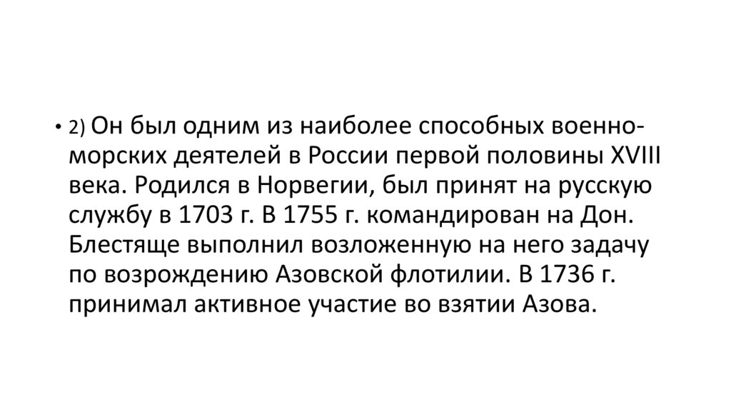 • 2) Он был одним из наиболее способных военно-морских деятелей в России первой половины XVIII