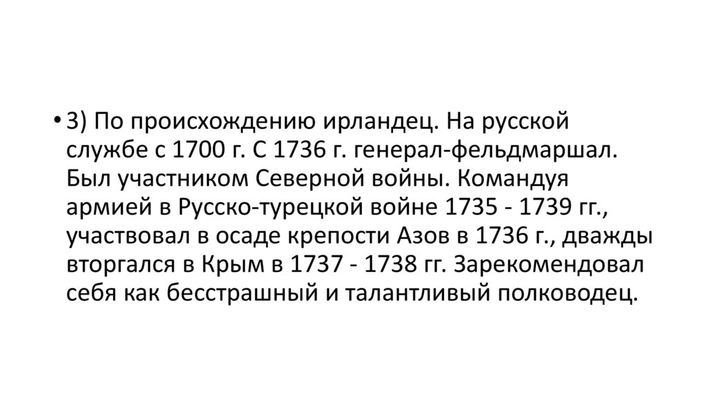 • 3) По происхождению ирландец. На русскойслужбе с 1700 г. С 1736 г. генерал-фельдмаршал.
