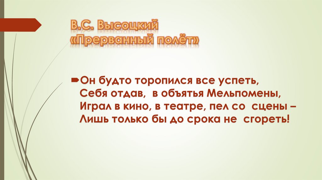 Он будто торопился все успеть,Себя отдав, в объятья Мельпомены,