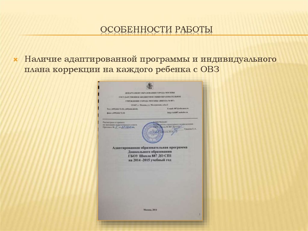 ОСОБЕННОСТИ РАБОТЫНаличие адаптированной программы и индивидуального