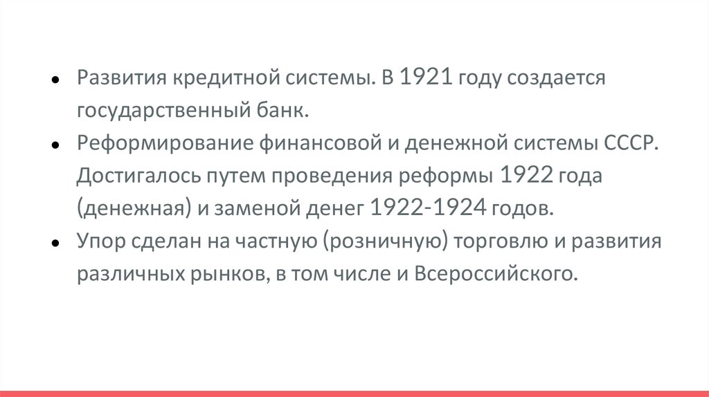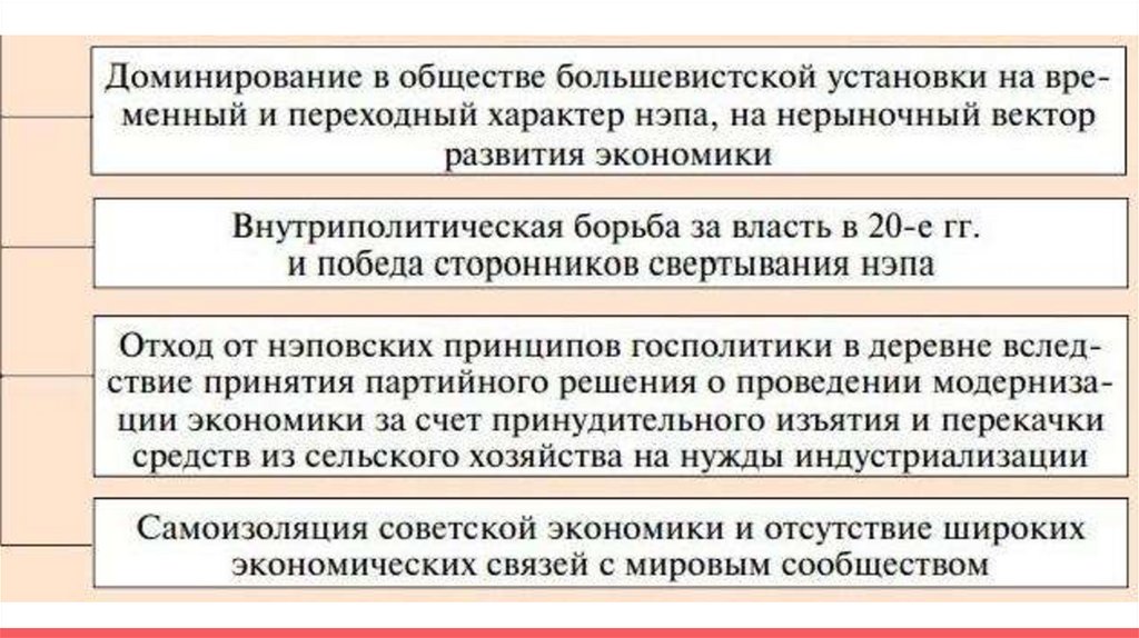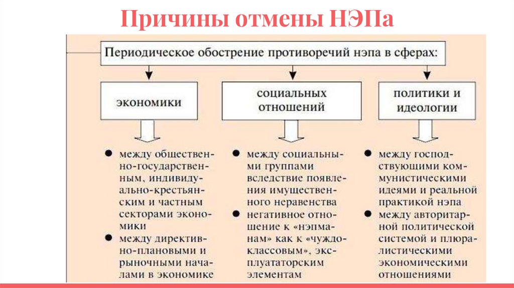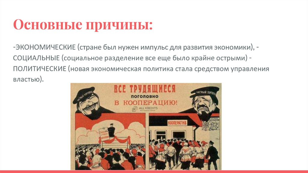 Основные причины:-ЭКОНОМИЧЕСКИЕ (стране был нужен импульс для развития экономики), СОЦИАЛЬНЫЕ (социальное разделение все еще было крайне острыми) ПОЛИТИЧЕСКИЕ (новая экономическая политика стала средством управления