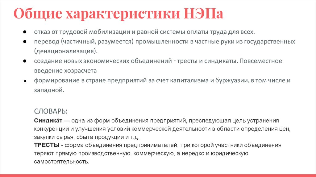 Общие характеристики НЭПаотказ от трудовой мобилизации и равной системы оплаты труда для всех.