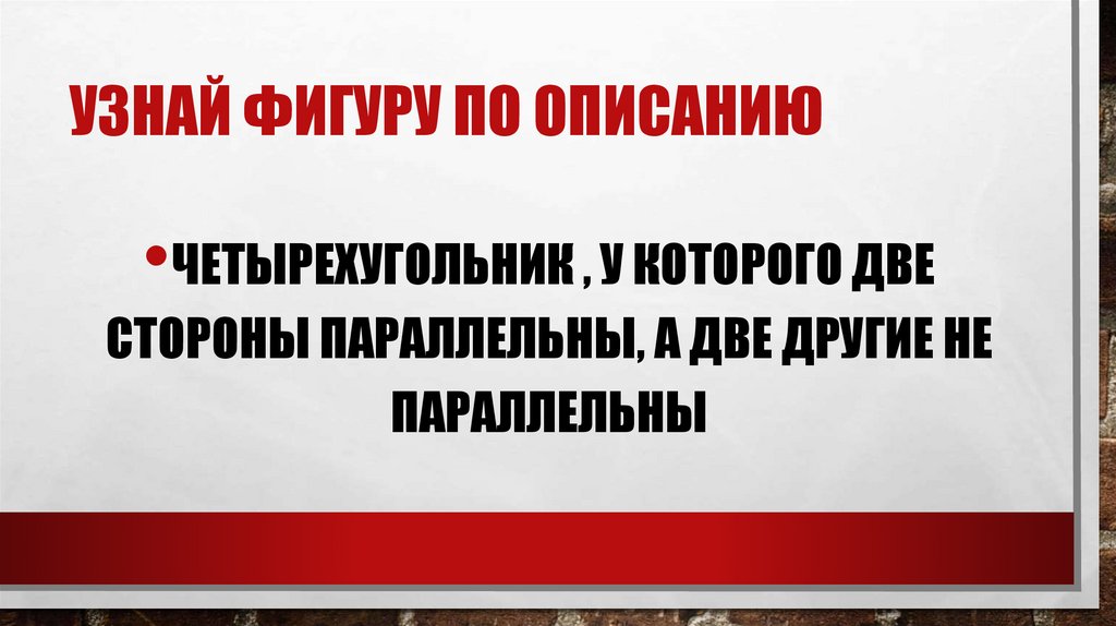 УЗНАЙ ФИГУРУ ПО ОПИСАНИЮ•ЧЕТЫРЕХУГОЛЬНИК , У КОТОРОГО ДВЕ
