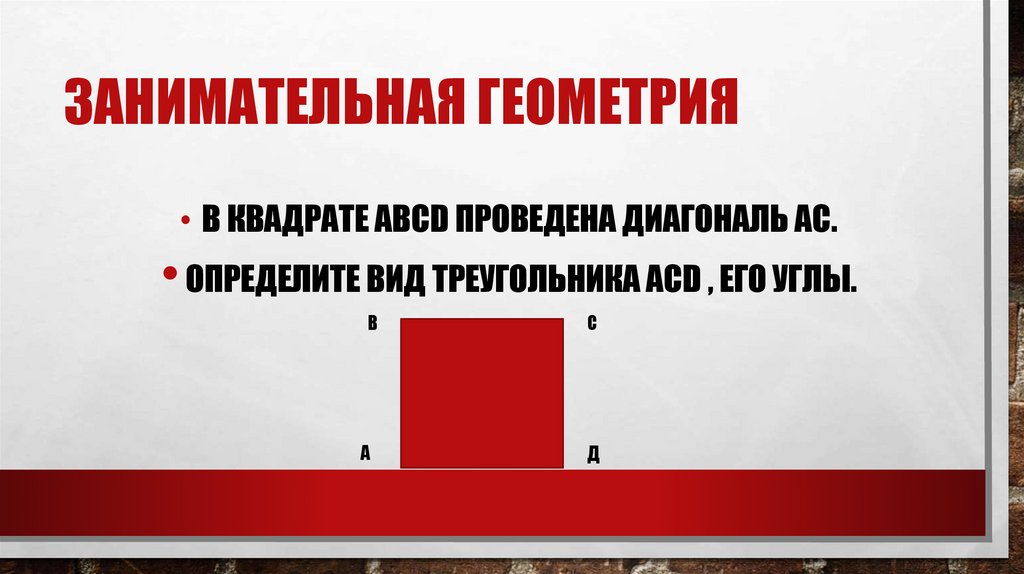 ЗАНИМАТЕЛЬНАЯ ГЕОМЕТРИЯ• В КВАДРАТЕ ABCD ПРОВЕДЕНА ДИАГОНАЛЬ АС.