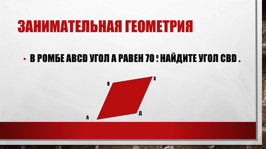 ЗАНИМАТЕЛЬНАЯ ГЕОМЕТРИЯ• В РОМБЕ ABCD УГОЛ А РАВЕН 70 0. НАЙДИТЕ УГОЛ CBD .