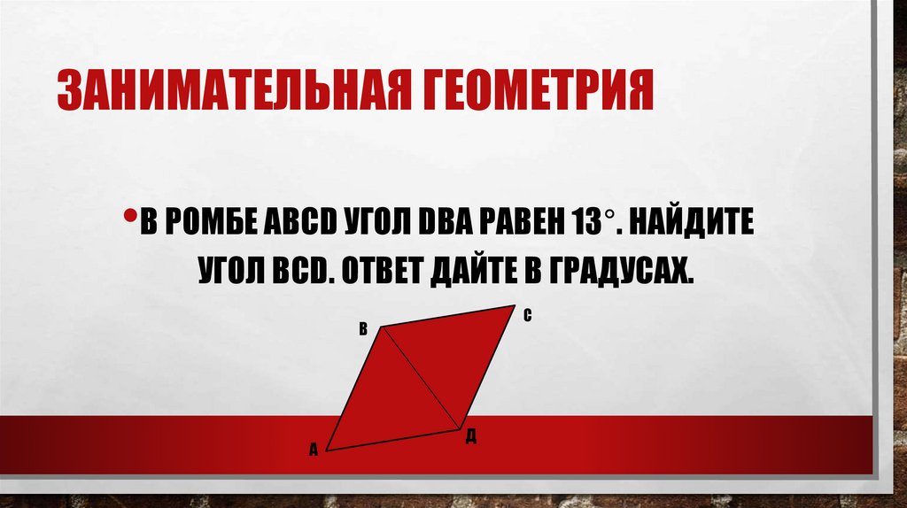 ЗАНИМАТЕЛЬНАЯ ГЕОМЕТРИЯ•В РОМБЕ ABCD УГОЛ DBA РАВЕН 13°. НАЙДИТЕ