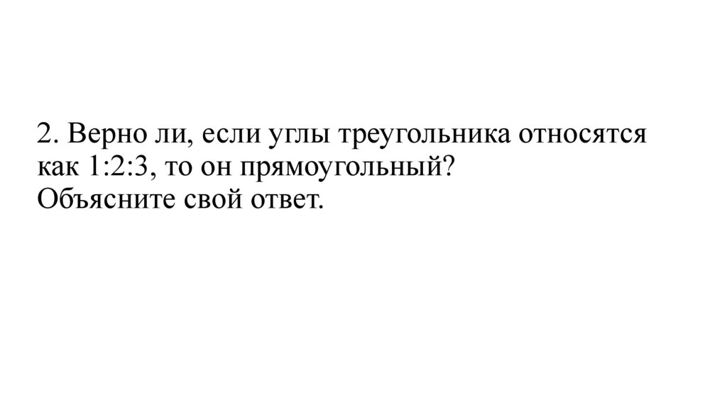 2. Верно ли, если углы треугольника относятсякак 1:2:3, то он прямоугольный?