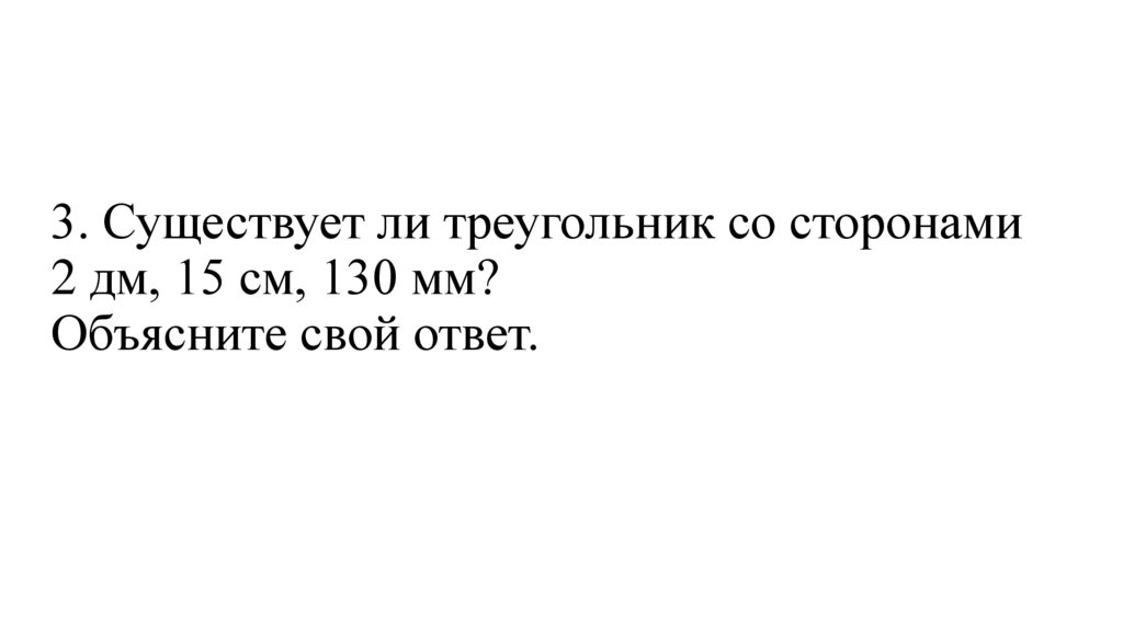 3. Существует ли треугольник со сторонами2 дм, 15 см, 130 мм?