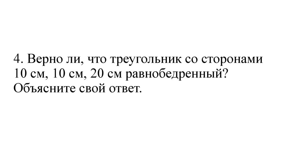 4. Верно ли, что треугольник со сторонами10 см, 10 см, 20 см равнобедренный?
