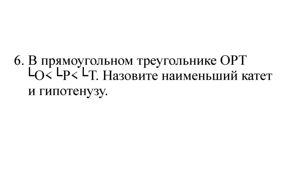 6. В прямоугольном треугольнике ОРТ└О<└Р<└Т. Назовите наименьший катет