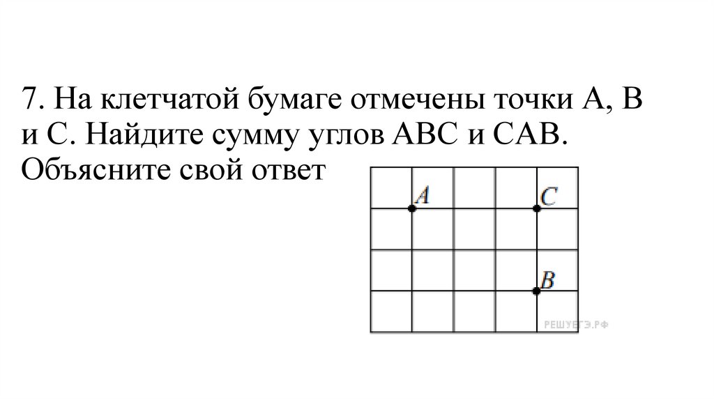 7. На клетчатой бумаге отмечены точки А, Ви С. Найдите сумму углов ABC и CAB.
