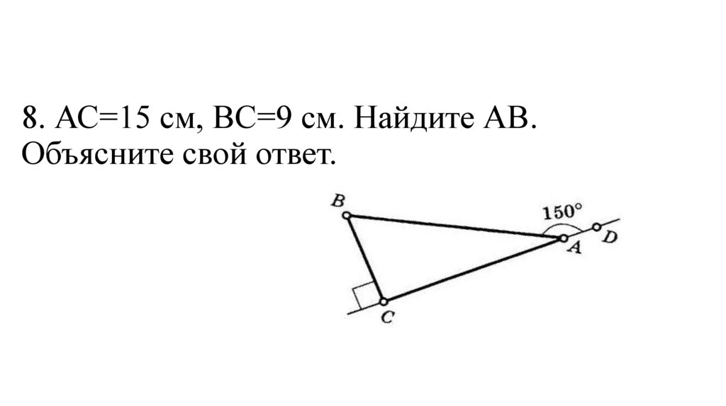 8. АС=15 см, ВС=9 см. Найдите АВ.Объясните свой ответ.