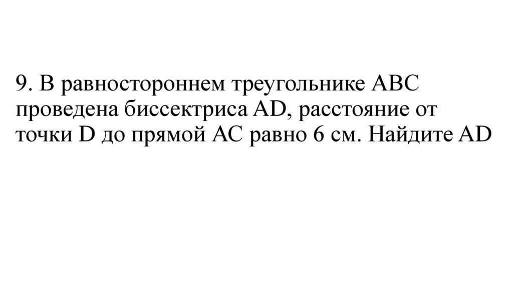 9. В равностороннем треугольнике АВСпроведена биссектриса AD, расстояние от