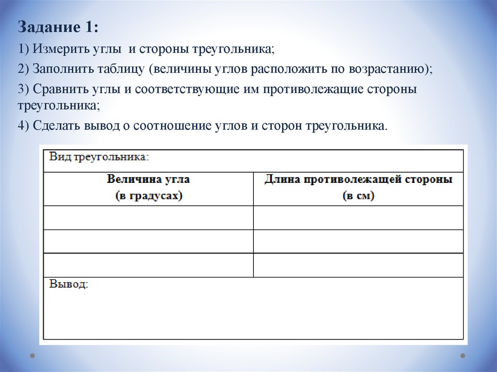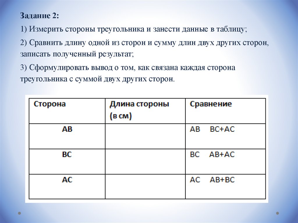 Задание 2:1) Измерить стороны треугольника и занести данные в таблицу;