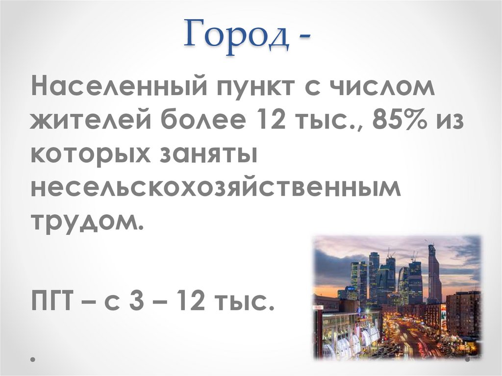 Город Населенный пункт с числомжителей более 12 тыс., 85% из