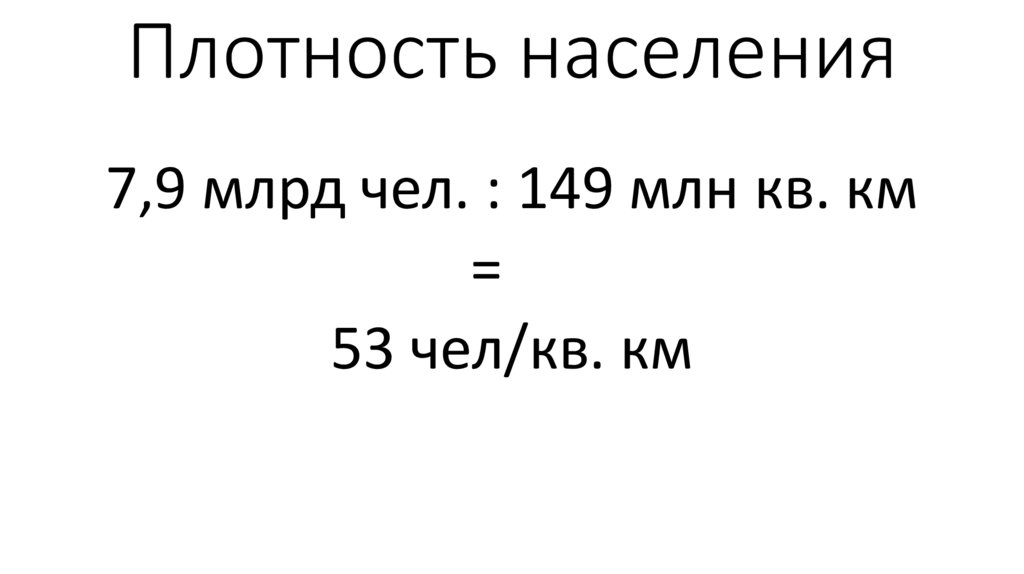 Плотность населения7,9 млрд чел. : 149 млн кв. км