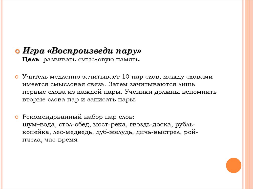 Игра «Воспроизведи пару»Цель: развивать смысловую память.
