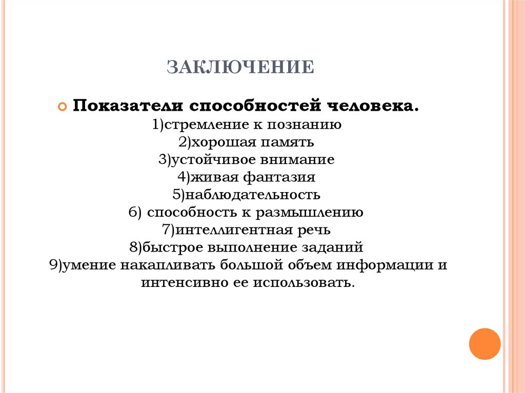 ЗАКЛЮЧЕНИЕПоказатели способностей человека.
