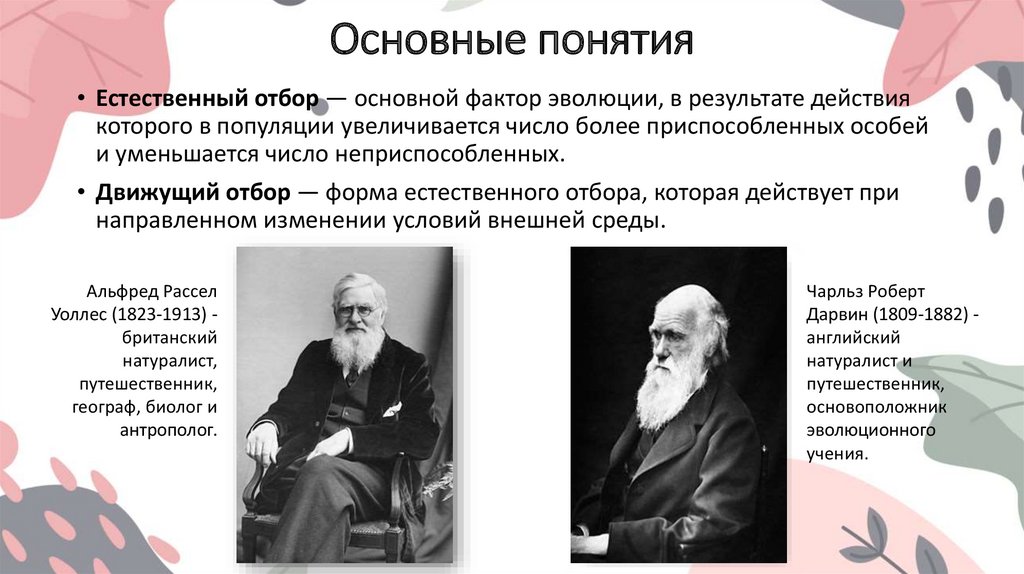 Основные понятия• Естественный отбор — основной фактор эволюции, в результате действия