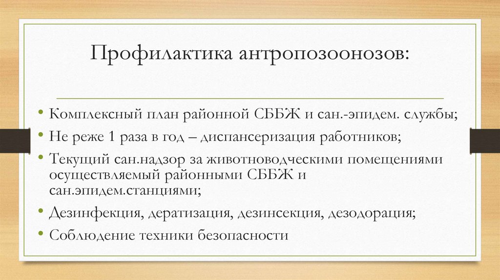 Профилактика антропозоонозов:• Комплексный план районной СББЖ и сан.-эпидем. службы;