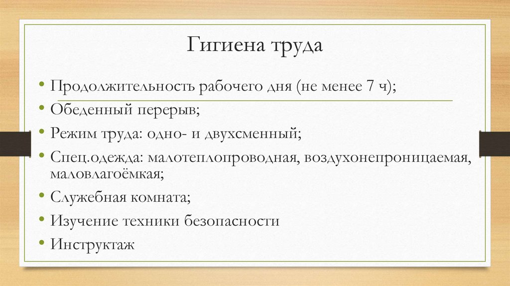 Гигиена труда• Продолжительность рабочего дня (не менее 7 ч);