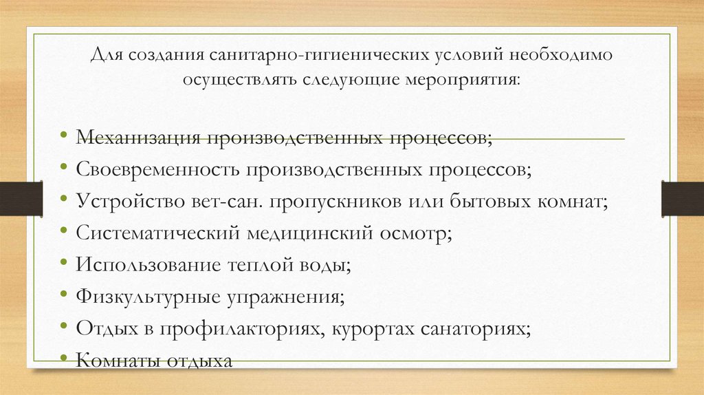 Для создания санитарно-гигиенических условий необходимоосуществлять следующие мероприятия: