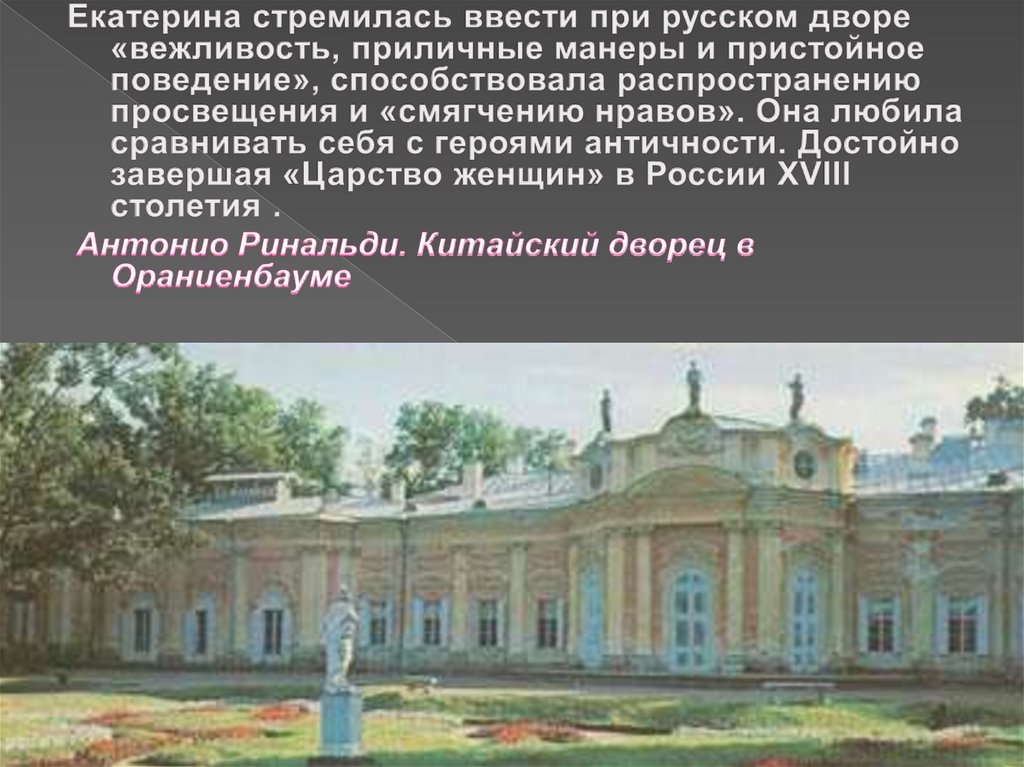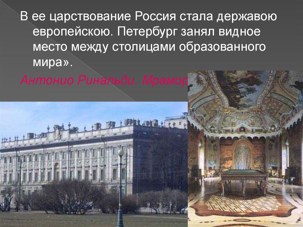 В ее царствование Россия стала державоюевропейскою. Петербург занял видное