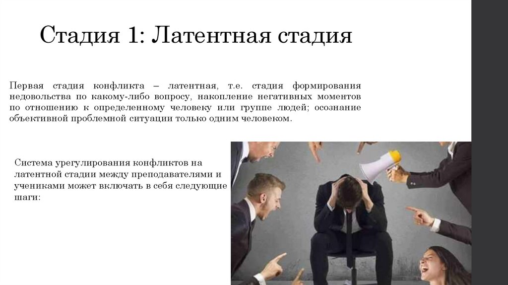 Стадия 1: Латентная стадияПервая стадия конфликта – латентная, т.е. стадия формирования