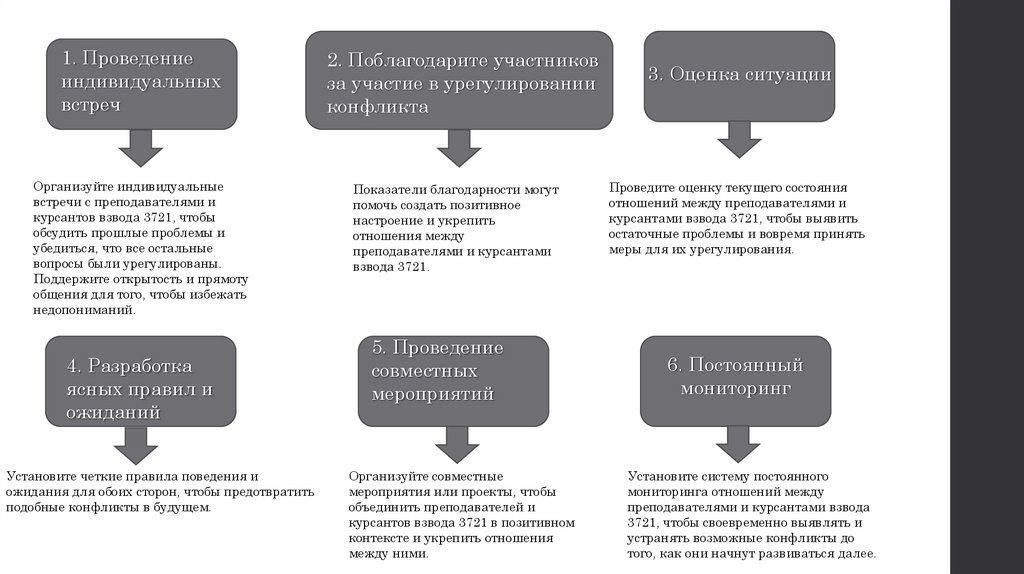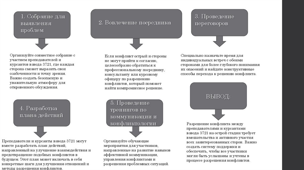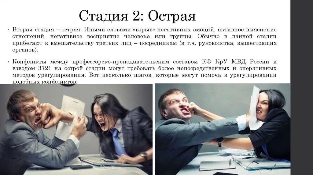 «накала» ситуации, поиск вариантов разрешения конфликта, либо