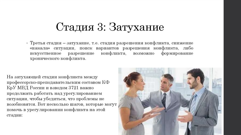 Стадия 3: Затухание• Третья стадия – затухание, т.е. стадия разрешения конфликта, снижение