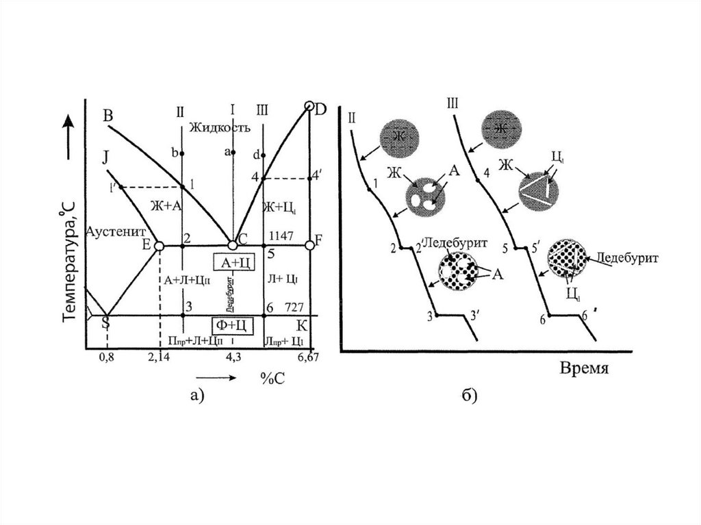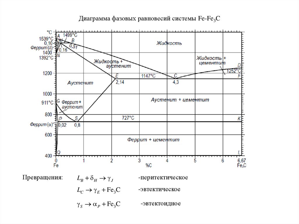 Диаграмма фазовых равновесий системы Fe-Fe3CПревращения: