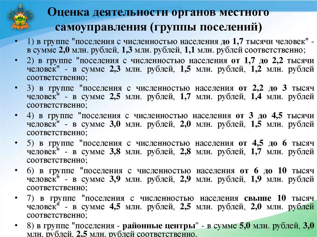 • 1) в группе "поселения с численностью населения до 1,7 тысячи человек" в сумме 2,0 млн. рублей, 1,3 млн. рублей, 1,1 млн. рублей соответственно;