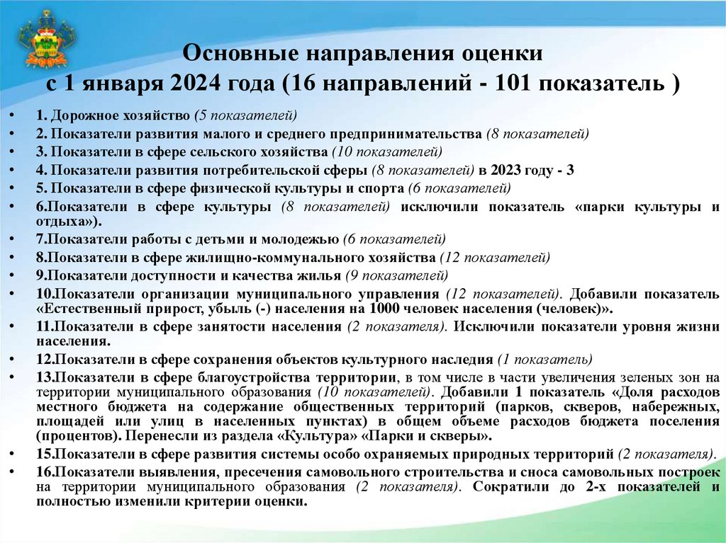 Основные направления оценкис 1 января 2024 года (16 направлений - 101 показатель )