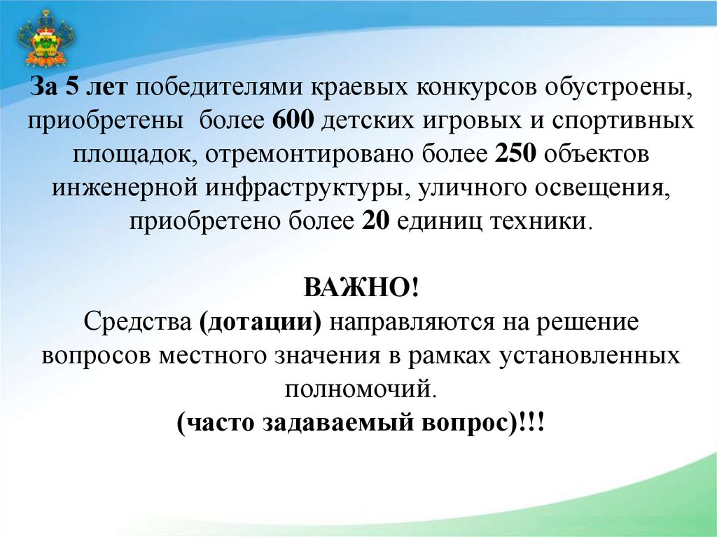 За 5 лет победителями краевых конкурсов обустроены,приобретены более 600 детских игровых и спортивных