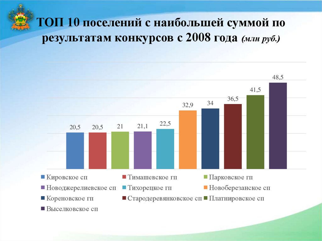 ТОП 10 поселений с наибольшей суммой порезультатам конкурсов с 2008 года (млн руб.)