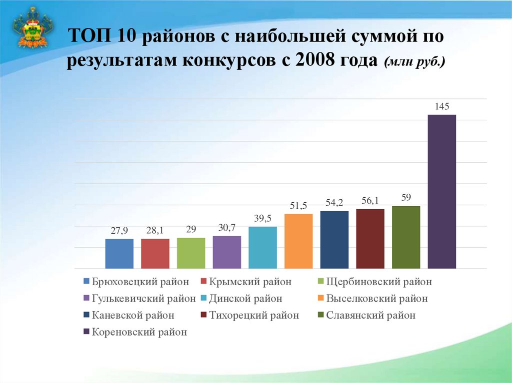 ТОП 10 районов с наибольшей суммой порезультатам конкурсов с 2008 года (млн руб.)