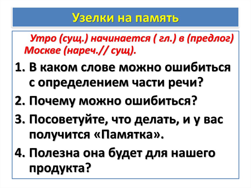 Узелки на памятьУтро (сущ.) начинается ( гл.) в (предлог)