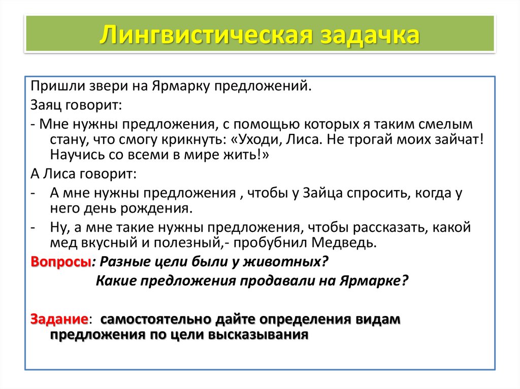 Лингвистическая задачкаПришли звери на Ярмарку предложений.