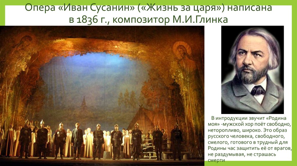 Опера «Иван Сусанин» («Жизнь за царя») написанав 1836 г., композитор М.И.Глинка