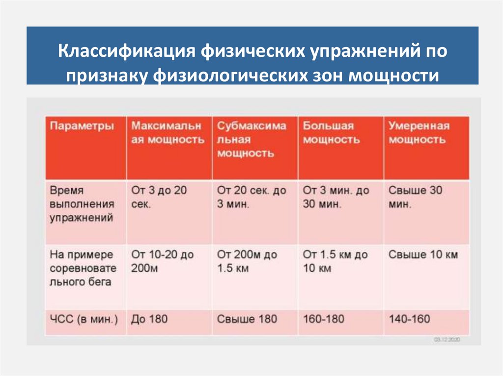 Классификация физических упражнений попризнаку физиологических зон мощности