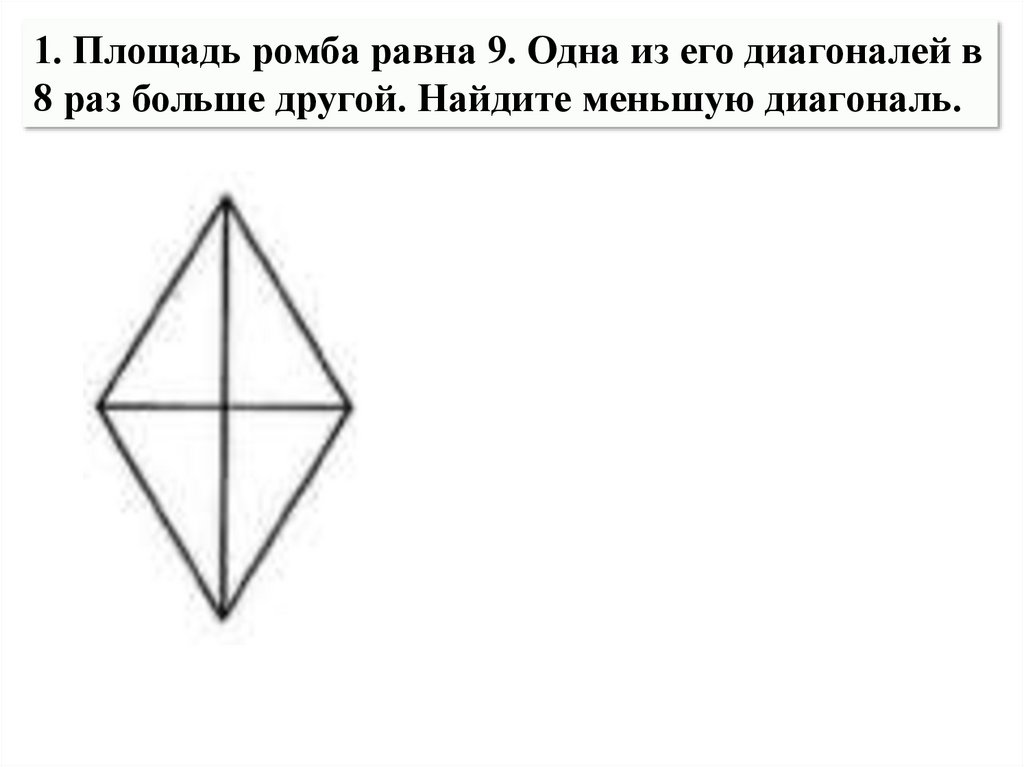 1. Площадь ромба равна 9. Одна из его диагоналей в8 раз больше другой. Найдите меньшую диагональ.