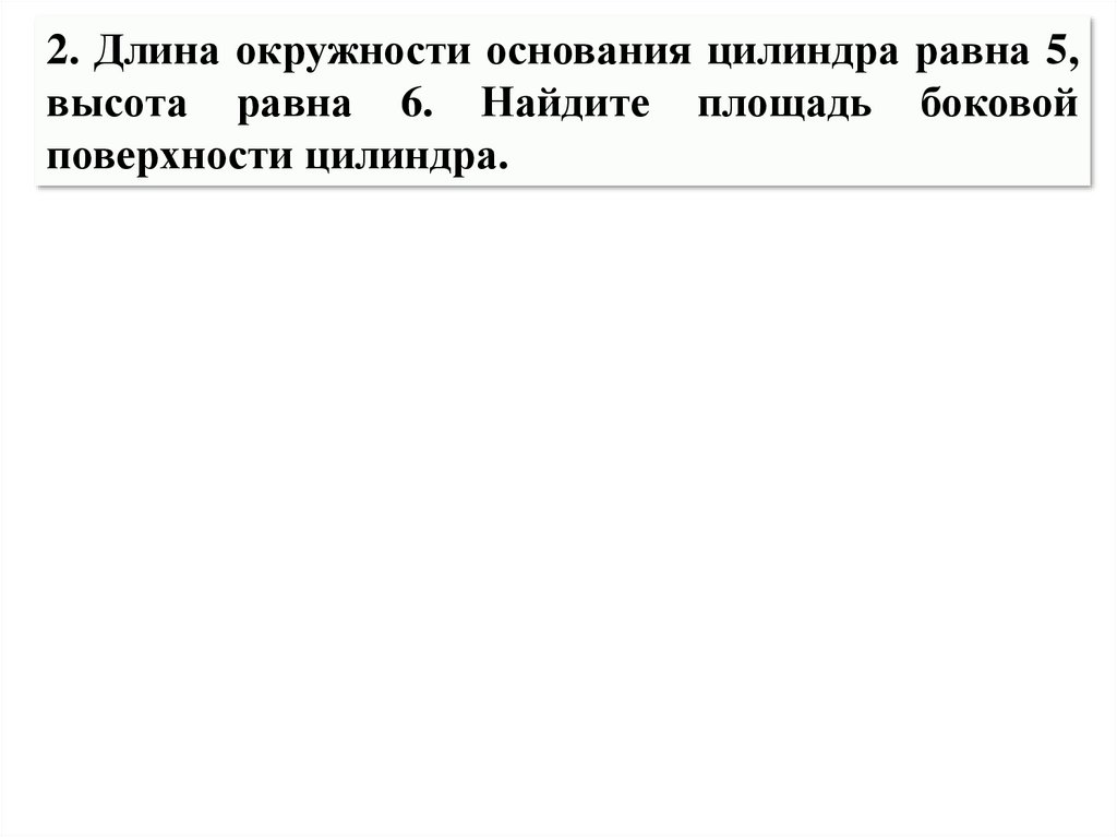 2. Длина окружности основания цилиндра равна 5,высота равна 6. Найдите площадь боковой