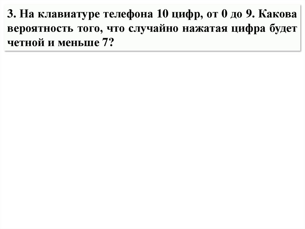 3. На клавиатуре телефона 10 цифр, от 0 до 9. Каковавероятность того, что случайно нажатая цифра будет
